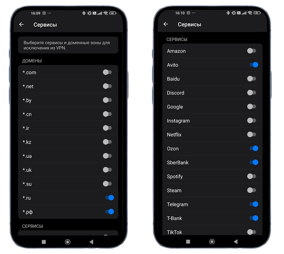 Настройте умное исключение для VPN Отметьте галочками российские сайты и сервисы (.ru, .рф, Avito, Сбер, Озон, Telegram и др.), чтобы работать с ними БЕЗ VPN.