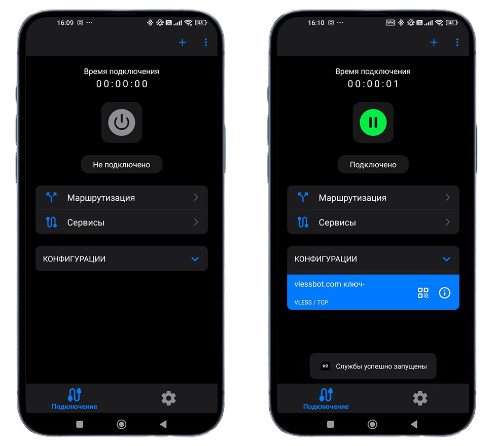 Через 3-5 секунд в статусбаре (вверху экрана) появляется значок VPN — маленькая иконка с надписью «VPN» или символом замка. Это значит, что всё работает.